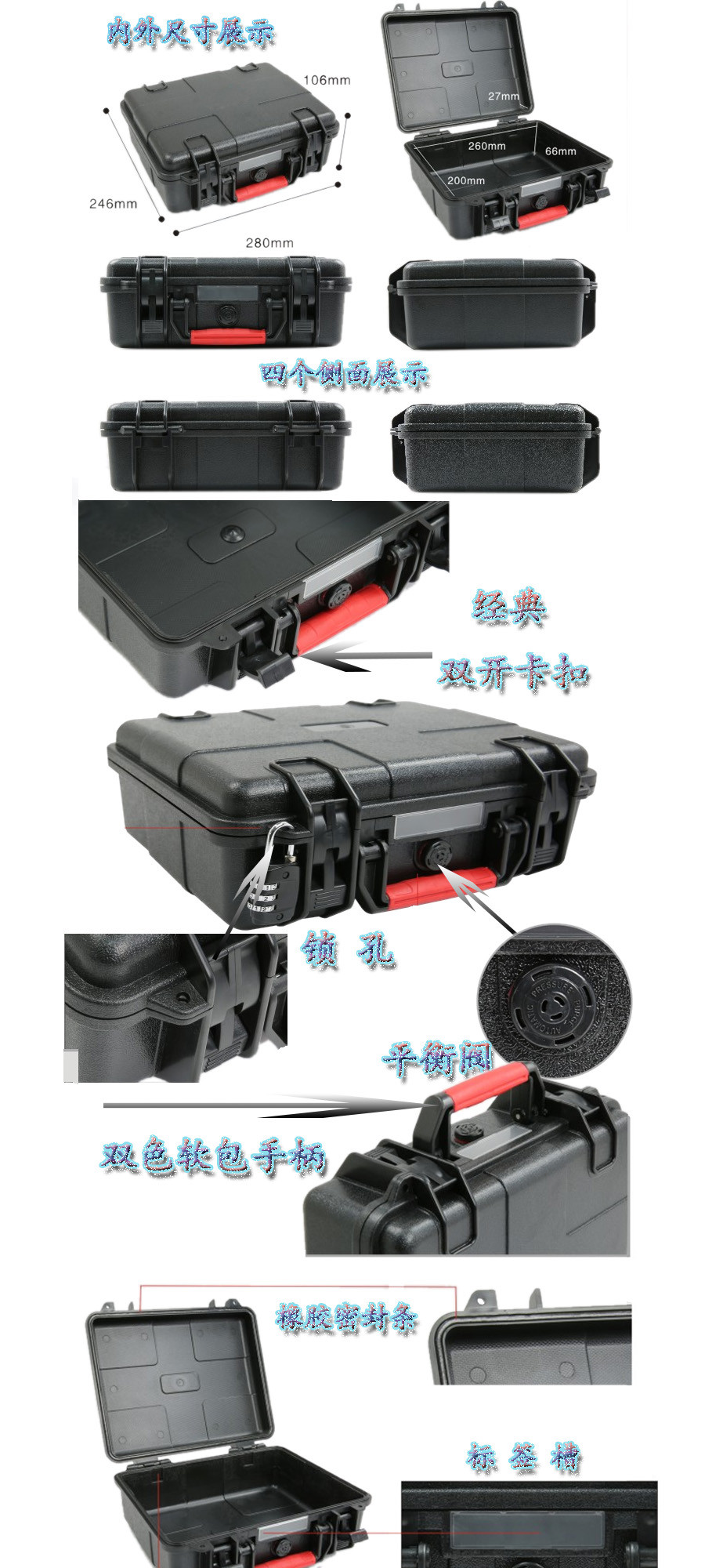 簡(jiǎn)要說(shuō)明:廣泛用于傳媒、公安、消防、軍隊(duì)、航空、戶外攝影、野外考察、科學(xué)探測(cè)等眾多領(lǐng)域的高端儀器、儀表。具有高強(qiáng)度、高抗壓沖擊、防潮、絕對(duì)密封、防塵、防水等特點(diǎn)。產(chǎn)品材質(zhì):ABS原料,箱體采用高抗沖擊的高分子聚合材料一體注塑成型,密封采用扁型彈性發(fā)泡密封橡膠條,確保防水氣密,所有較軸均采用不銹鋼材質(zhì)。
