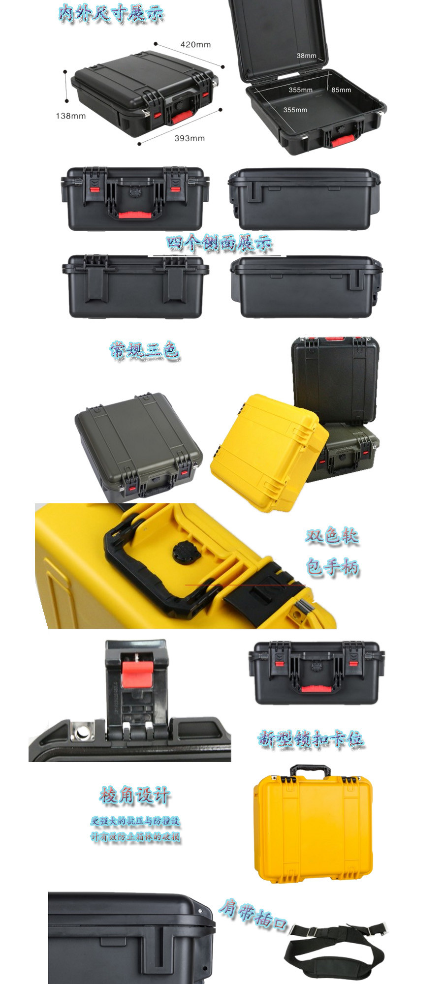簡要說明:廣泛用于傳媒、公安、消防、軍隊、航空、戶外攝影、野外考察、科學探測等眾多領域的高端儀器、儀表。具有高強度、高抗壓沖擊、防潮、絕對密封、防塵、防水等特點。產品材質:ABS原料,箱體采用高抗沖擊的高分子聚合材料一體注塑成型,密封采用扁型彈性發(fā)泡密封橡膠條,確保防水氣密,所有較軸均采用不銹鋼材質。