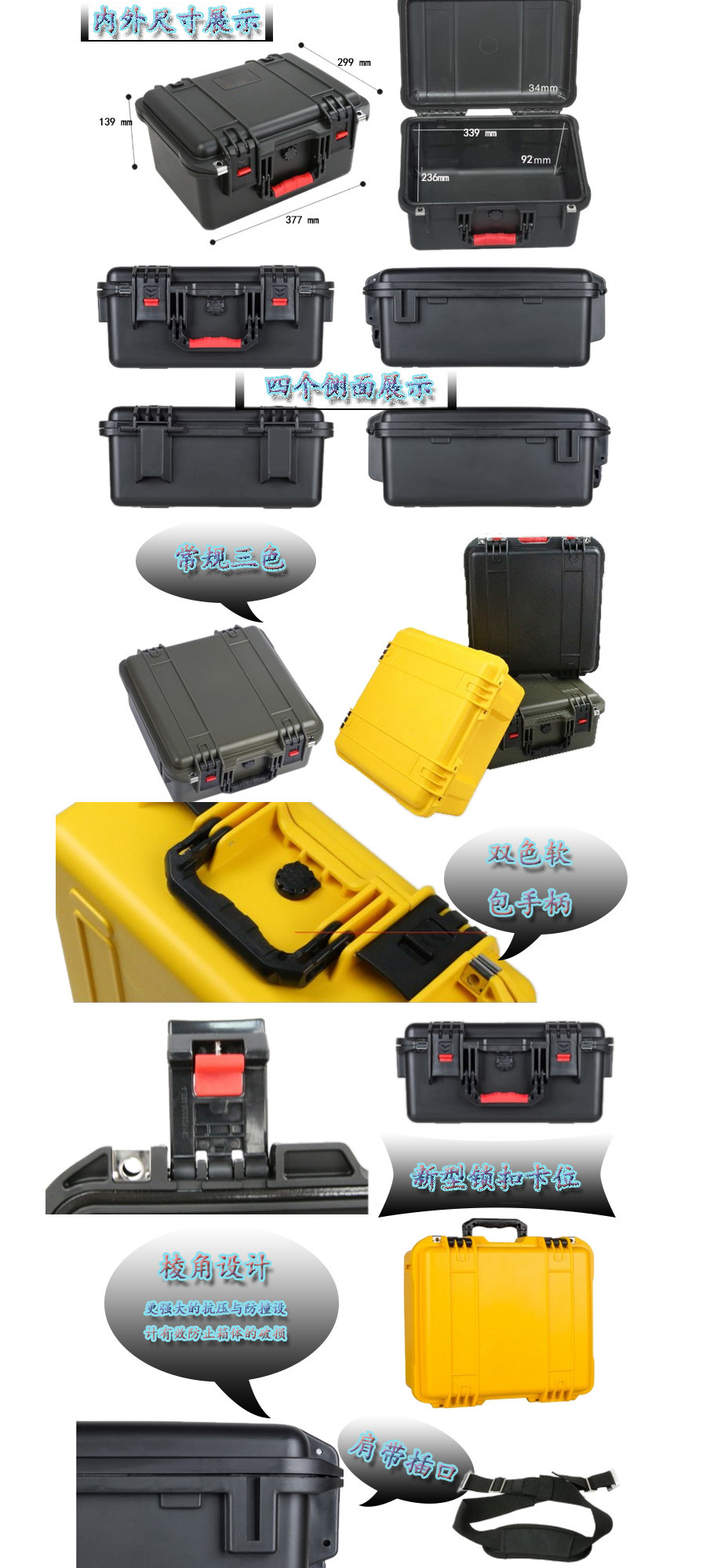 簡要說明:廣泛用于傳媒、公安、消防、軍隊、航空、戶外攝影、野外考察、科學探測等眾多領域的高端儀器、儀表。具有高強度、高抗壓沖擊、防潮、絕對密封、防塵、防水等特點。產(chǎn)品材質(zhì):ABS原料,箱體采用高抗沖擊的高分子聚合材料一體注塑成型,密封采用扁型彈性發(fā)泡密封橡膠條,確保防水氣密,所有較軸均采用不銹鋼材質(zhì)。