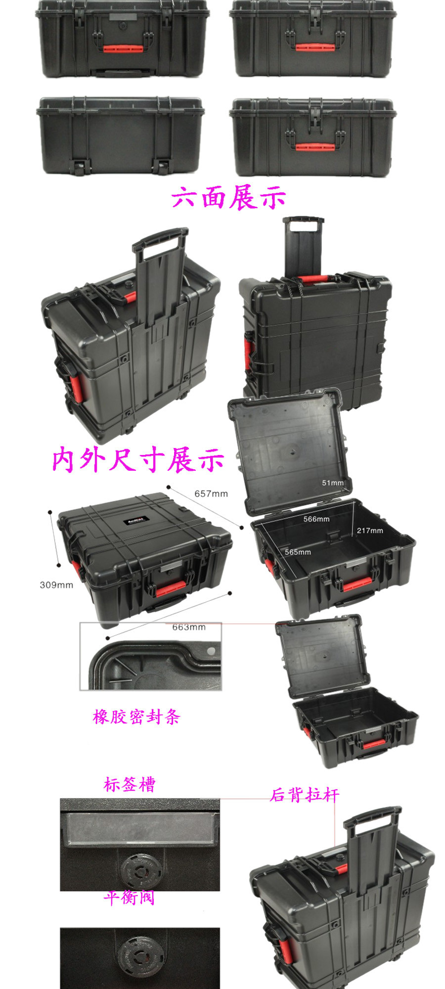 簡要說明:廣泛用于傳媒、公安、消防、軍隊(duì)、航空、戶外攝影、野外考察、科學(xué)探測等眾多領(lǐng)域的高端儀器、儀表。具有高強(qiáng)度、高抗壓沖擊、防潮、絕對密封、防塵、防水等特點(diǎn)。產(chǎn)品材質(zhì):ABS原料,箱體采用高抗沖擊的高分子聚合材料一體注塑成型,密封采用扁型彈性發(fā)泡密封橡膠條,確保防水氣密,所有較軸均采用不銹鋼材質(zhì)。